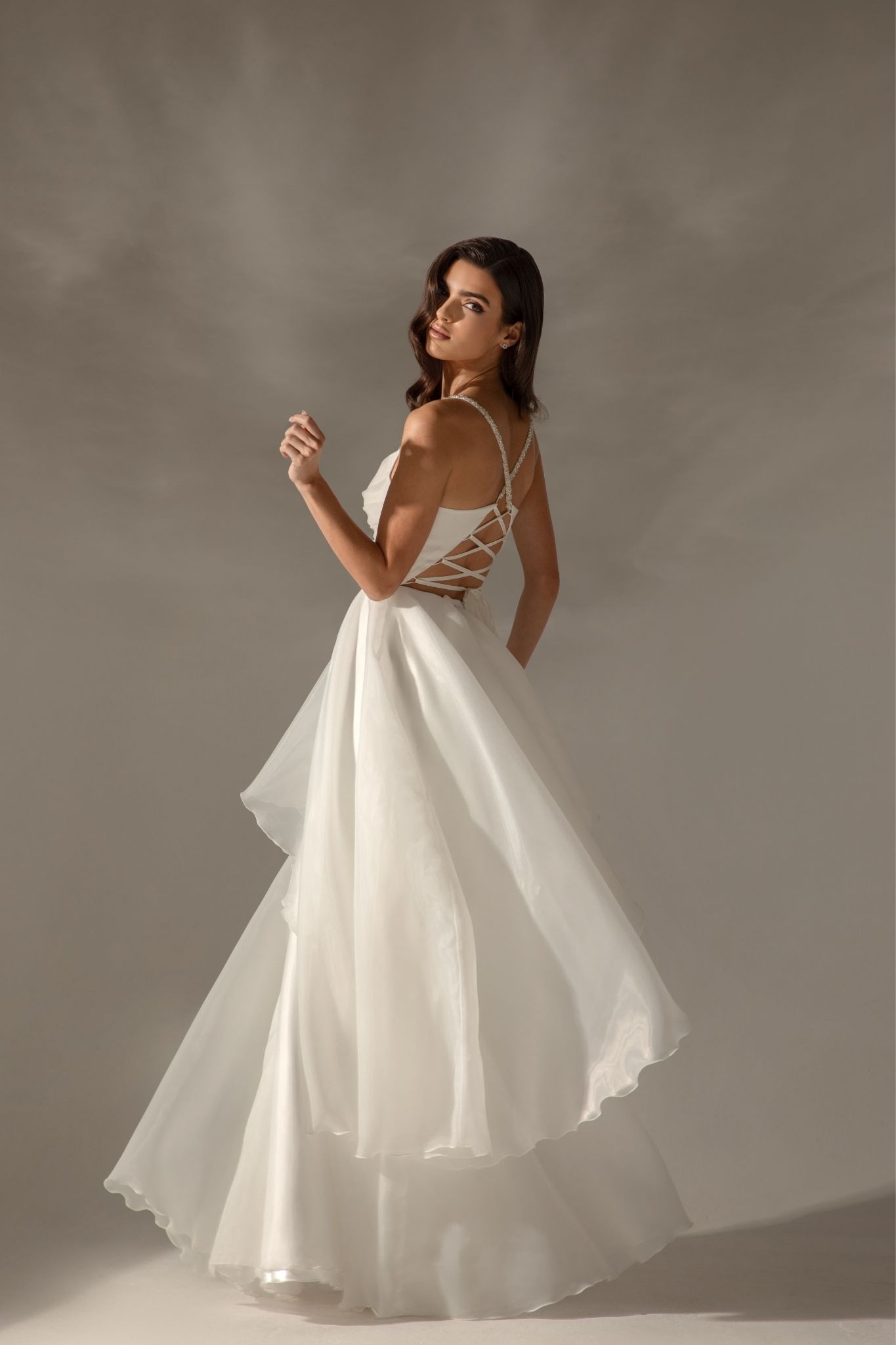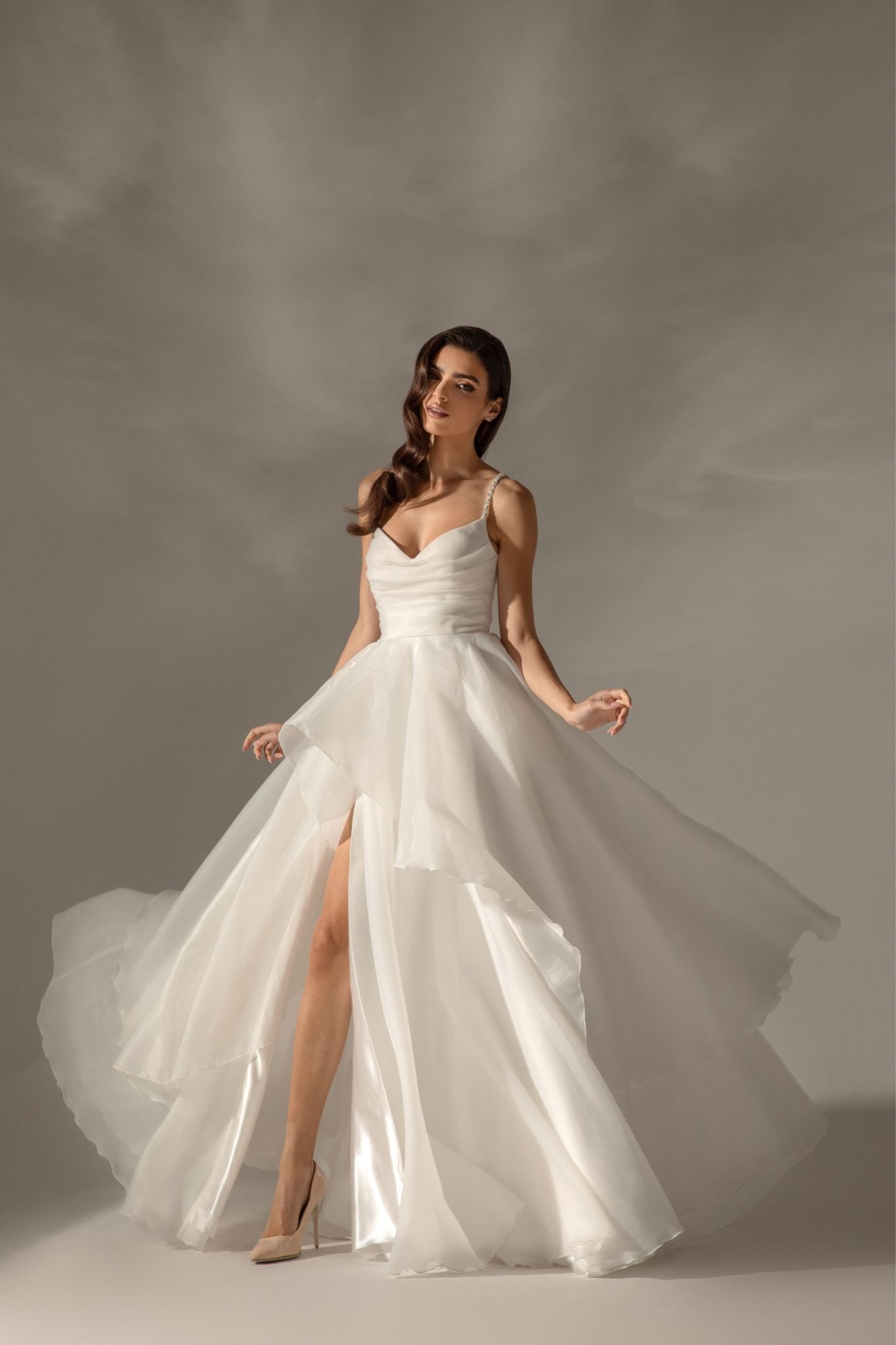 Чистите линии и класическата форма създават балансирана и женствена визия, подходяща за булки, търсещи съчетание между непреходна елегантност и модерна романтика.